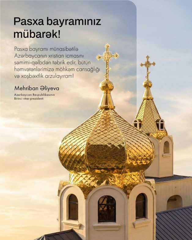 Azərbaycanın Birinci vitse-prezidenti Mehriban Əliyeva ölkənin xristian icmasını Pasxa bayramı münasibətilə səmimi arzularla təbrik edib.